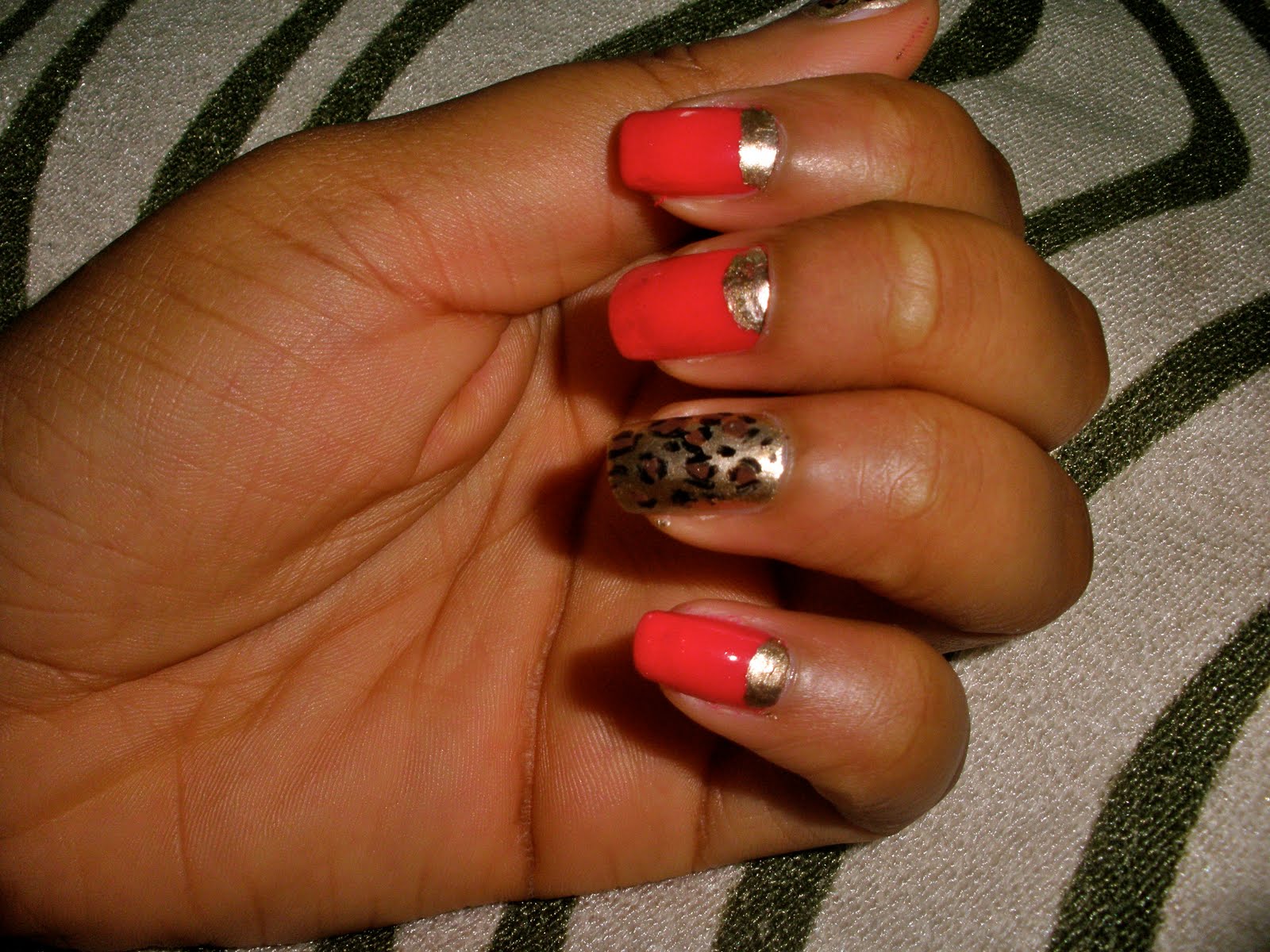 I don't really know how to explain this one :/ I did a diagonal design with pink and then painted the other half ? with the leopard print :/ Oh I actually painted the leopard print on, it's not a stamp... lots of people ask... I think thats all I have on this one it sounds complicated if i explain it.. Its better to look at the pictures :) Thanks for readingg (Please excuse my shorter nails :/ I'm still contemplating... I don't want to cut them all off, but I might have to..)